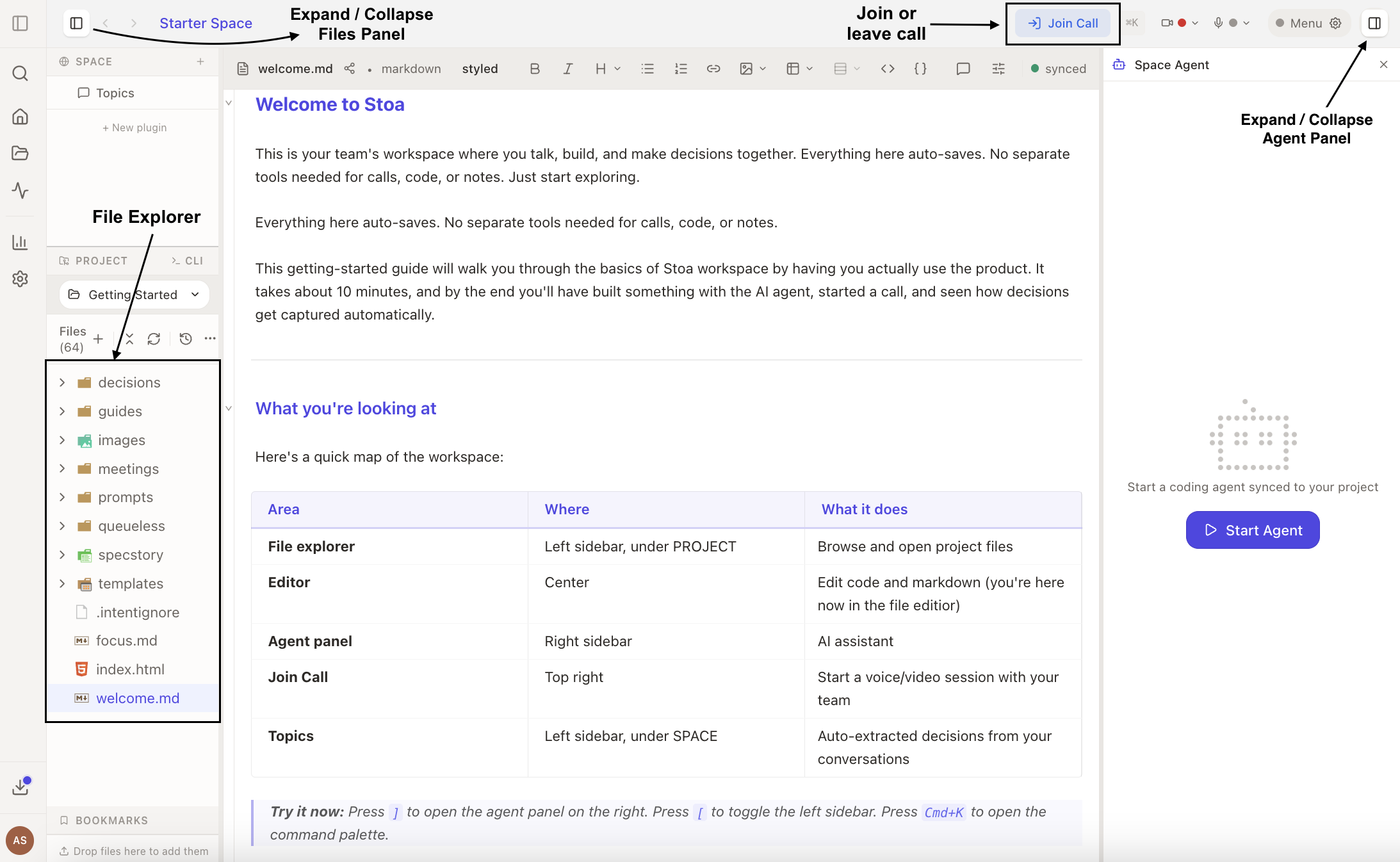 Work in Stoa happens inside sessions. Opening a Space routes you into the current session (or creates a new one), and joining the call connects voice and video. Each session includes: