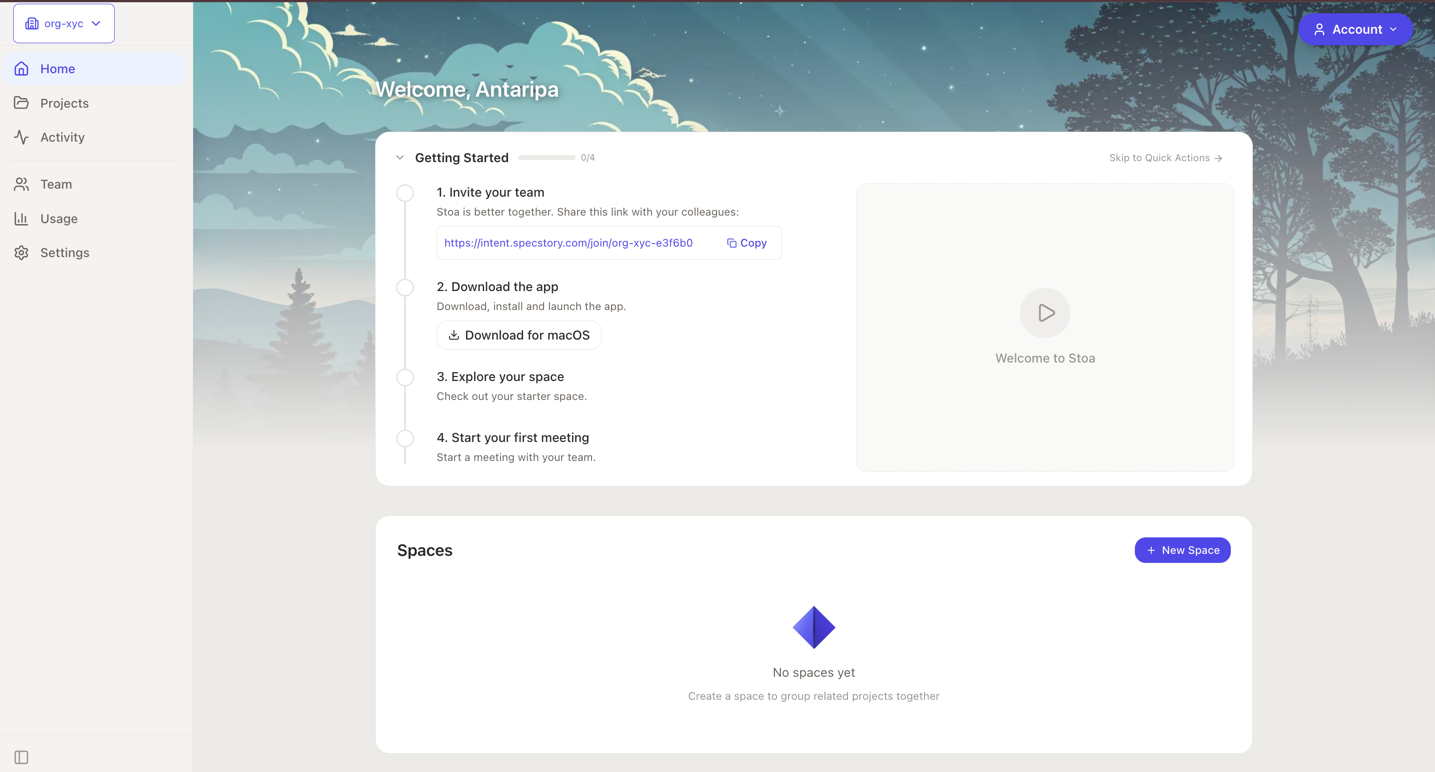 Teams are how you collaborate with others in Stoa. When you share a project with a team, every member can see it, join sessions, and work together. Each team gets its own dashboard, Spaces, settings, and billing.