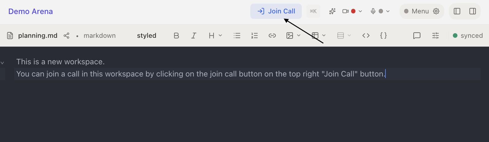 Click "Join Call" in the workspace to enter the room. You can also join automatically with the ?join=true URL parameter.